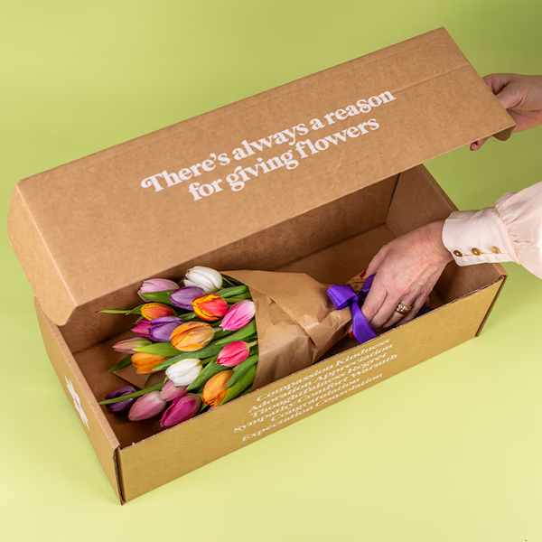 Ljuvlig tulpanbukett med 20 tulpaner i mixade färger. Med sina vackra nyanser är denna bukett en riktig glädjespridare. Perfekt till födelsedagar, viktiga jubileer och allt annat du vill fira. För att göra din gåva extra lyxig får du choklad från Lindt på köpet. Varje blomma är noga utvald för att skapa en bukett lika vacker som prisvärd. För att klara frakten levereras blommorna i knopp. Gör ett nytt snitt i stjälkarna och sätt dem i vatten så kommer de snart slå ut i full blom. Välj en passande vas och njut av magin. Den här buketten skickas i en spårbar blomsterbox för extra wow-effekt.